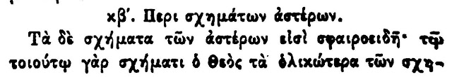''Κάποιοι είχαν την γνώμη, ότι ο ήλιος και οι αστέρες τρέφονται από τους ανερχόμενους ατμούς από τη γη, και γι' αυτό η κίνηση του ηλίου κάνει λόξωση,που εξαρτάται από τους ατμούς. Αυτό όμως φαίνεται να είναι ψεύδος ,ούτε ανασκευή χρειάζεται. Μόνο τα έμψυχα σώματα τρέφονται , τα δε στοιχεία μεταβάλλονται σε άλλα, τα δε ουράνια σώματα κάνουν μόνο την τοπική τους κίνηση, και είναι ανεπίδεκτα άλλων κινήσεων.''